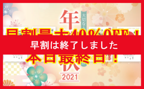 キャンペーンについて年賀状早割 最終日! お買得タイプの【早割】 お買得タイプの印刷代が 40%OFF !!【期間:12月10日(木)まで】 ※ネット受付は12月13日(日)まで※別途基本料金と郵便はがき代がかかります。※お申し込...